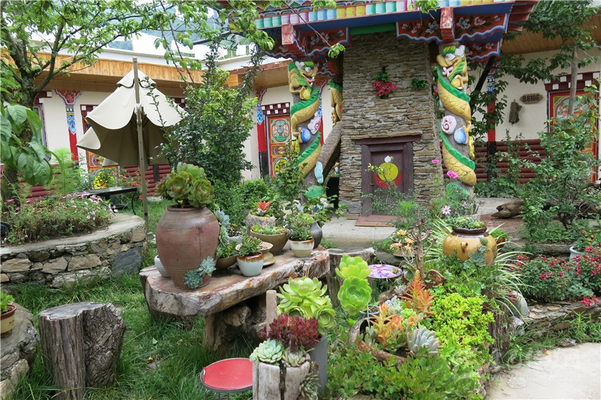 這座民宿坐落于克格依村,緊鄰原生態(tài)田園,庭外滿目青翠、古碉林立,庭內(nèi)花草滿園、瓜果飄香,時(shí)而傳來一聲鳥鳴,更顯園中幽靜。民宿的前臺(tái)既是游客接待中心,也是一座小型的博物館,展示著古宅數(shù)代主人的精心收藏。