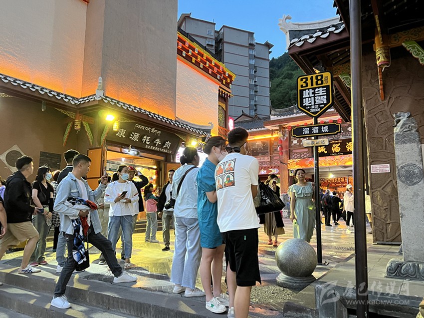 隨著夜幕降臨,在網(wǎng)絡(luò)上熱度不減的康定夜景逐漸展現(xiàn),游客們漫步折多河畔,感受避暑勝地帶來(lái)的涼爽。
