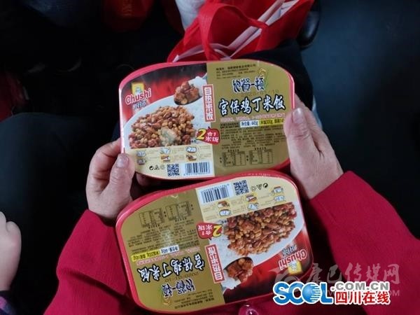 18日中午12時(shí), 列車出發(fā)2小時(shí)后,巴中恩陽(yáng)人鄔兵領(lǐng)到了來(lái)自家鄉(xiāng)的午餐——一盒自熱米飯,配菜是宮保雞丁?!安诲e(cuò)不錯(cuò),今年不用吃方便面了?!倍松厦罪埖泥w兵笑了笑。