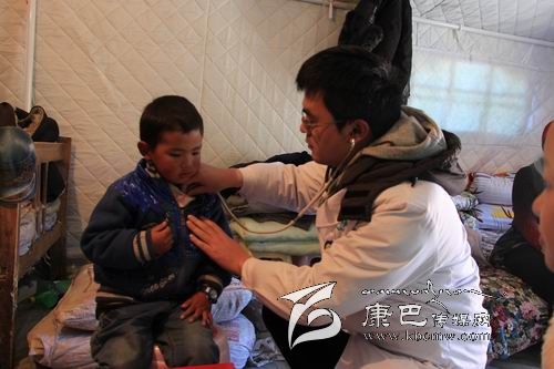 在新都橋鎮(zhèn)東俄洛三村的一頂救災(zāi)帳篷里,來自“雅安市抗震救災(zāi)醫(yī)療救援小組石棉分隊(duì)”的石棉縣人民醫(yī)院內(nèi)科醫(yī)生李登豐正在給當(dāng)?shù)貎和恋嵌嗉獧z查身體。土登多吉的母親說孩子這兩天感冒了,經(jīng)過檢查,李登豐發(fā)現(xiàn)土登多吉并未發(fā)燒,只是扁桃體有點(diǎn)發(fā)炎,于是趕緊讓同行的護(hù)理人員拿來了治療感冒和消炎的藥物。