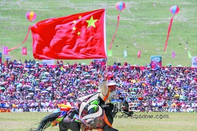 7月25日,第八屆康巴文化藝術節(jié)在玉樹藏族自治州開幕。數(shù)名參加開幕式的藏族老鄉(xiāng)高舉鮮艷的五星紅旗策馬狂奔,風馳電掣,跨越扎西科賽馬場,一瞬間,歡呼聲震耳欲聾,開幕式進入高潮。